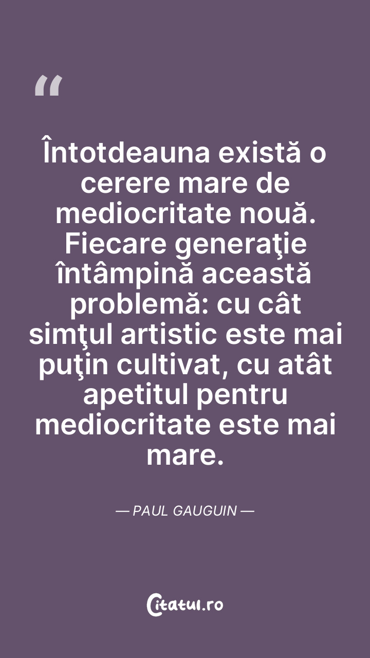 Întotdeauna există o cerere mare de mediocritate nouă. Fiecare generaţie întâmpină această problemă: cu cât simţul artistic este mai puţin cultivat, cu atât apetitul pentru mediocritate este mai mare. Paul Gauguin