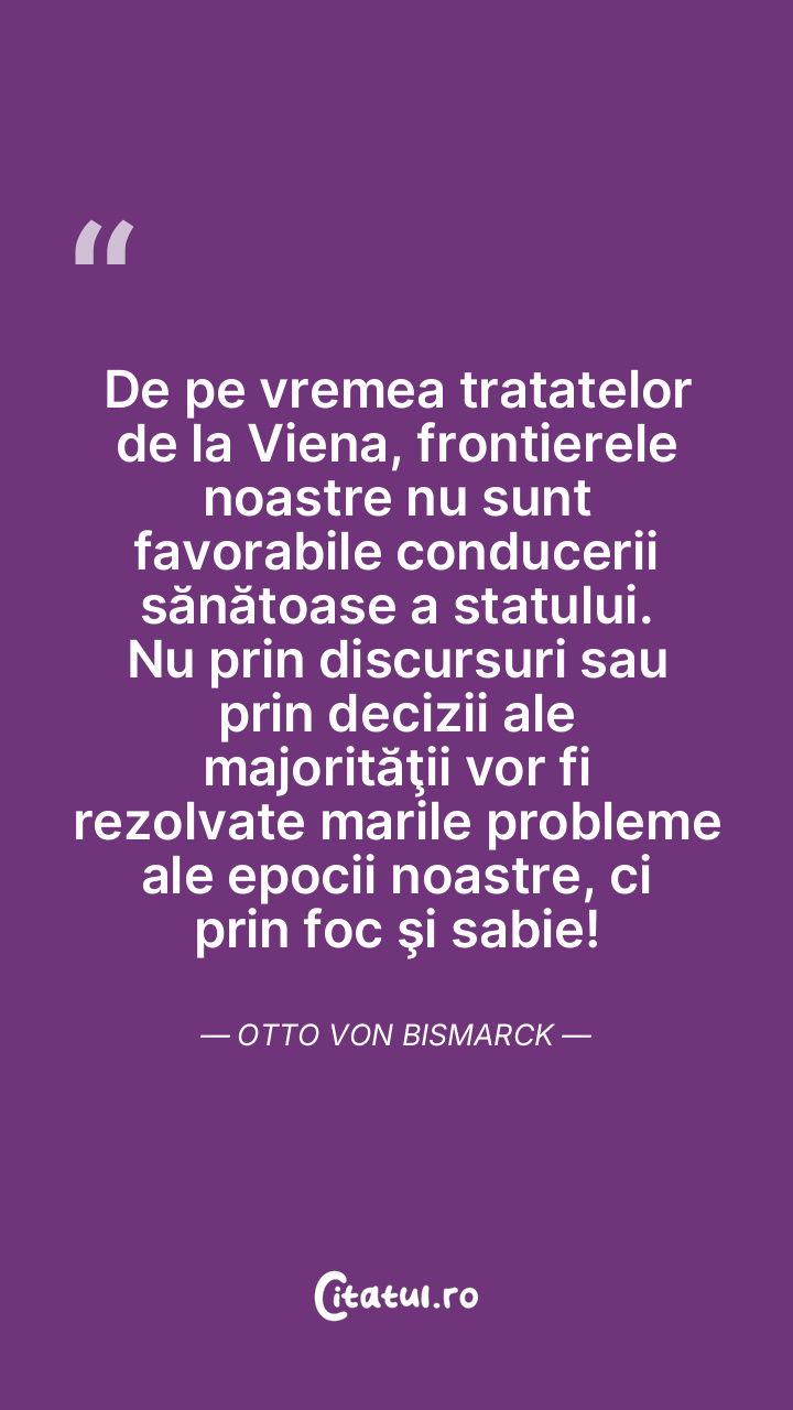 De pe vremea tratatelor de la Viena, frontierele noastre nu sunt favorabile conducerii sănătoase a statului. Nu prin discursuri sau prin decizii ale majorităţii vor fi rezolvate marile probleme ale epocii noastre, ci prin foc şi sabie! Otto von Bismarck