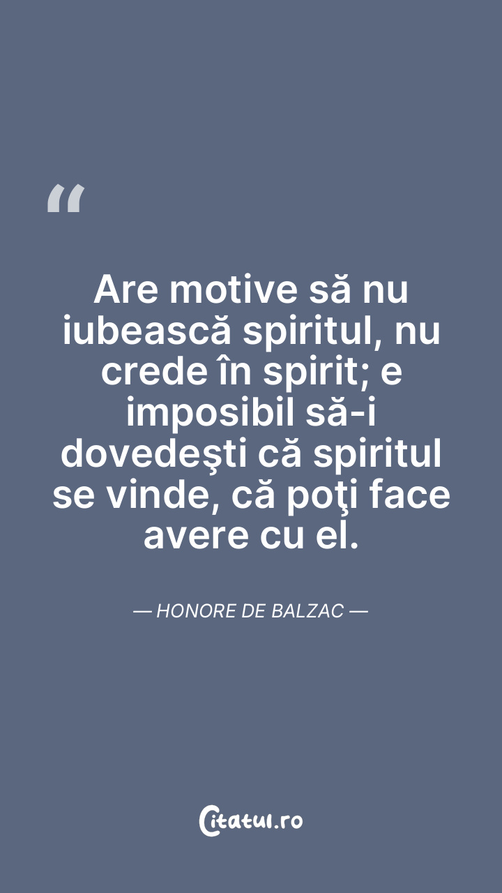 Are motive să nu iubească spiritul, nu crede în spirit; e imposibil să-i dovedeşti că spiritul se vinde, că poţi face avere cu el. Honore de Balzac