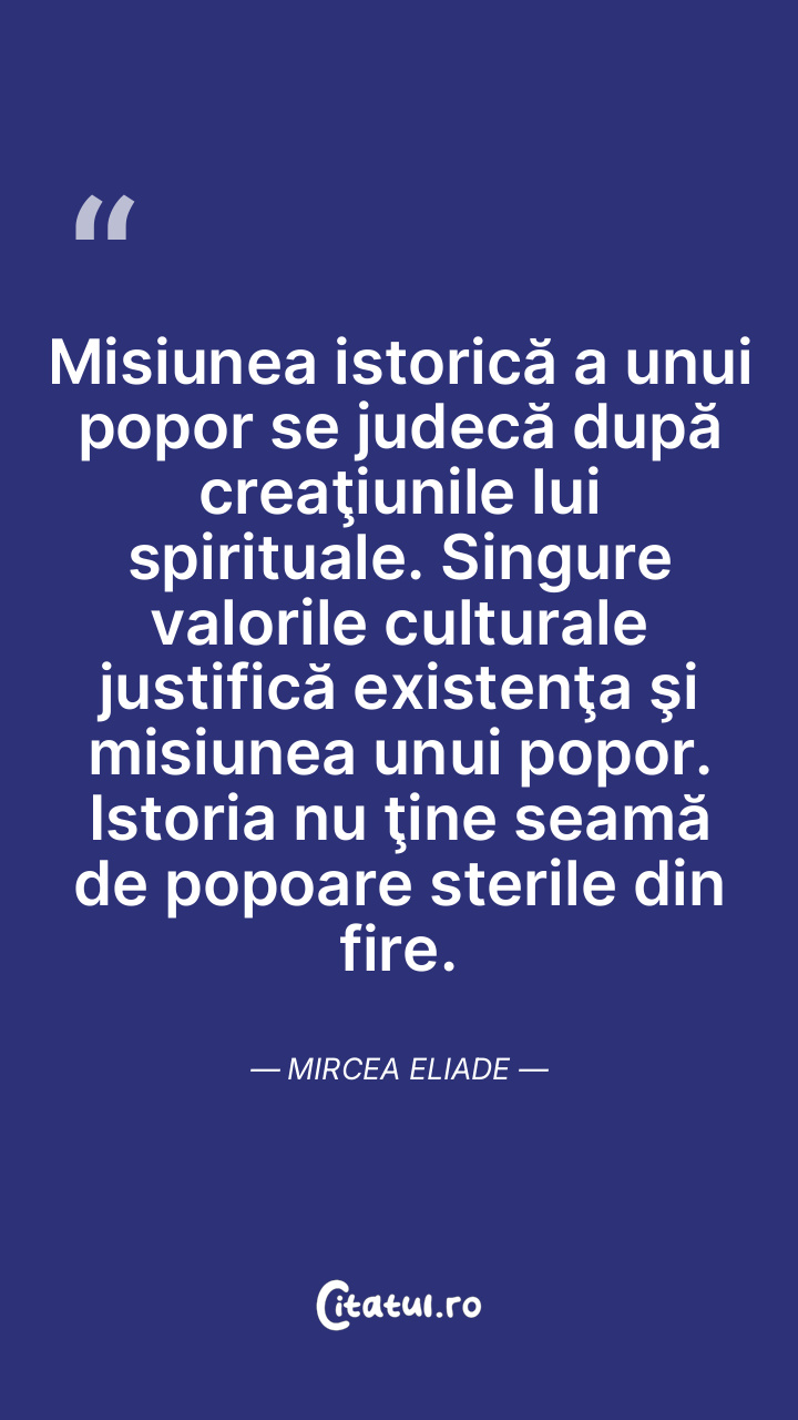 Misiunea istorică a unui popor se judecă după creaţiunile lui spirituale. Singure valorile culturale justifică existenţa şi misiunea unui popor. Istoria nu ţine seamă de popoare sterile din fire. Mircea Eliade