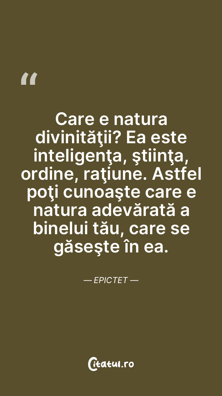 Care e natura divinităţii? Ea este inteligenţa, ştiinţa, ordine, raţiune. Astfel poţi cunoaşte care e natura adevărată a binelui tău, care se găseşte în ea. Epictet