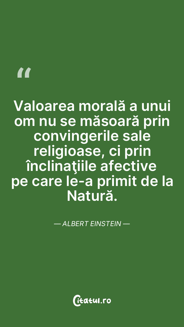 Valoarea morală a unui om nu se măsoară prin convingerile sale religioase, ci prin înclinaţiile afective pe care le-a primit de la Natură. Albert Einstein
