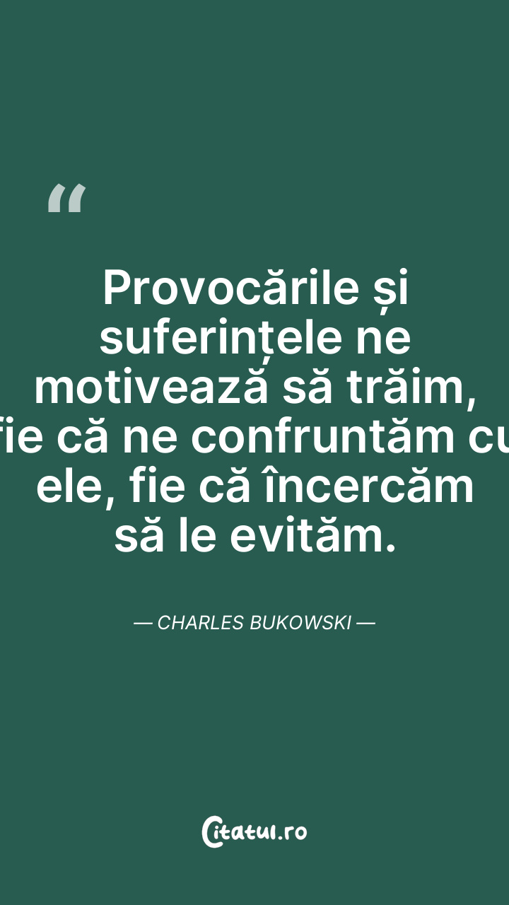 Provocările și suferințele ne motivează să trăim, fie că ne confruntăm cu ele, fie că încercăm să le evităm. Charles Bukowski