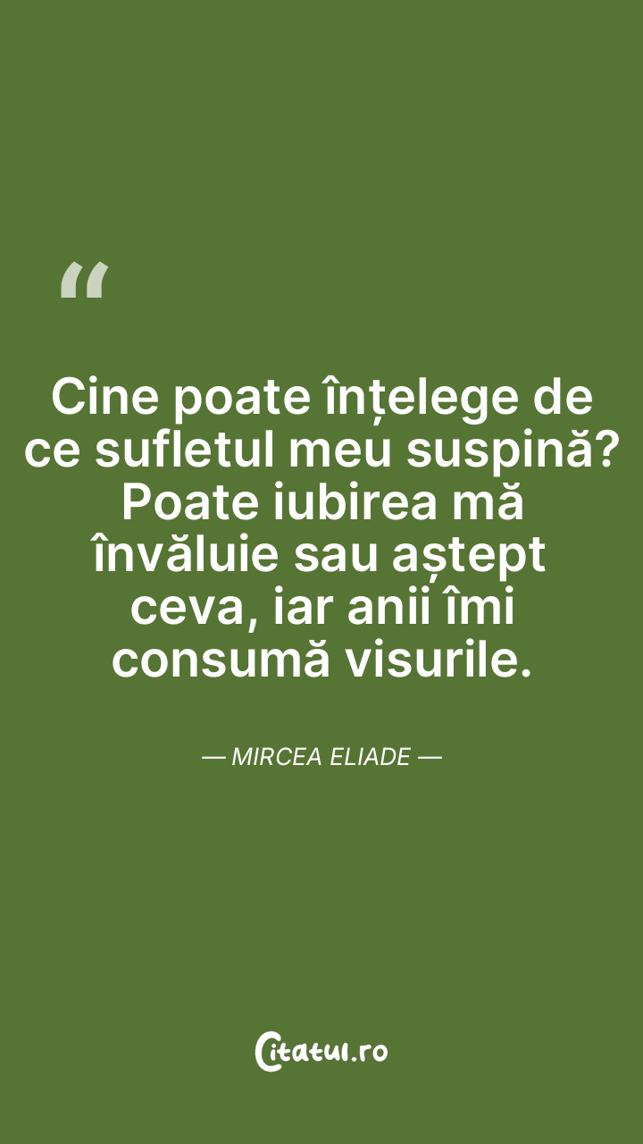 Cine poate înțelege de ce sufletul meu suspină? Poate iubirea mă învăluie sau aștept ceva, iar anii îmi consumă visurile. Mircea Eliade