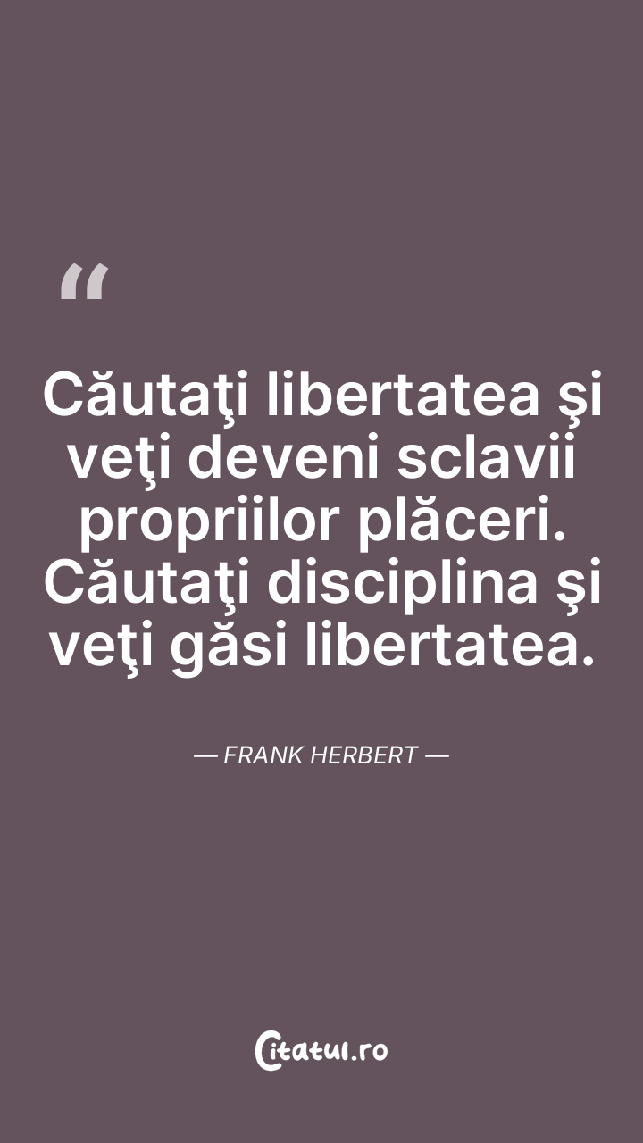 Căutaţi libertatea şi veţi deveni sclavii propriilor plăceri. Căutaţi disciplina şi veţi găsi libertatea. Frank Herbert