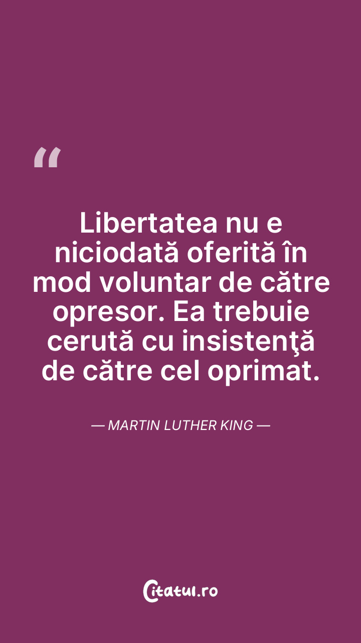 Libertatea nu e niciodată oferită în mod voluntar de către opresor. Ea trebuie cerută cu insistenţă de către cel oprimat. Martin Luther King