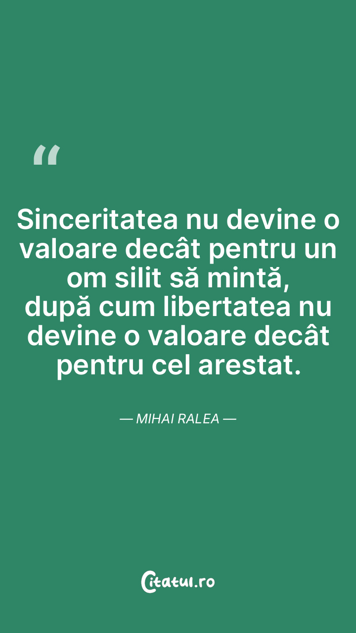 Sinceritatea nu devine o valoare decât pentru un om silit să mintă, după cum libertatea nu devine o valoare decât pentru cel arestat. Mihai Ralea