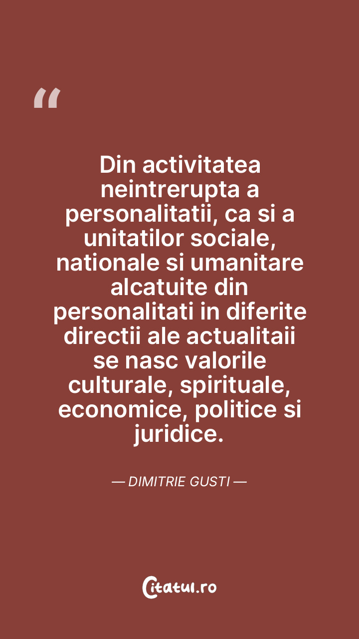 Din activitatea neintrerupta a personalitatii, ca si a unitatilor sociale, nationale si umanitare alcatuite din personalitati in diferite directii ale actualitaii se nasc valorile culturale, spirituale, economice, politice si juridice. Dimitrie Gusti