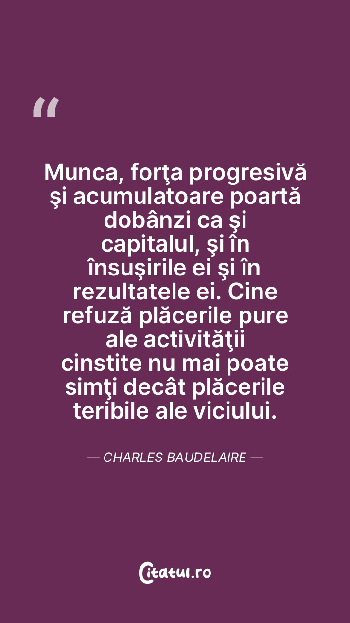 Munca, forţa progresivă şi acumulatoare poartă dobânzi ca şi capitalul, şi în însuşirile ei şi în rezultatele ei. Cine refuză plăcerile pure ale activităţii cinstite nu mai poate simţi decât plăcerile teribile ale viciului. Charles Baudelaire