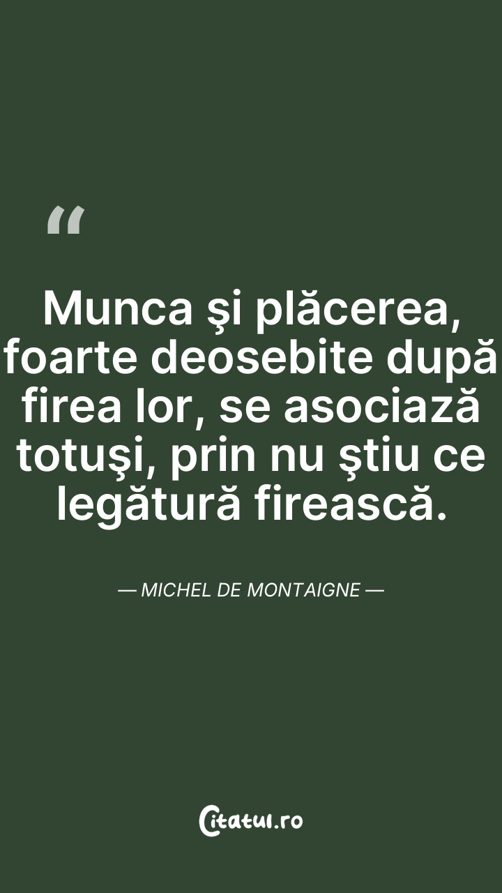 Munca şi plăcerea, foarte deosebite după firea lor, se asociază totuşi, prin nu ştiu ce legătură firească. Michel de Montaigne