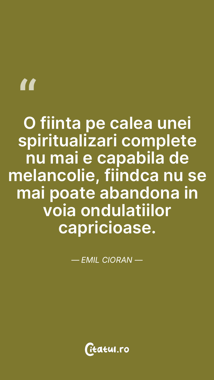 O fiinta pe calea unei spiritualizari complete nu mai e capabila de melancolie, fiindca nu se mai poate abandona in voia ondulatiilor capricioase. Emil Cioran