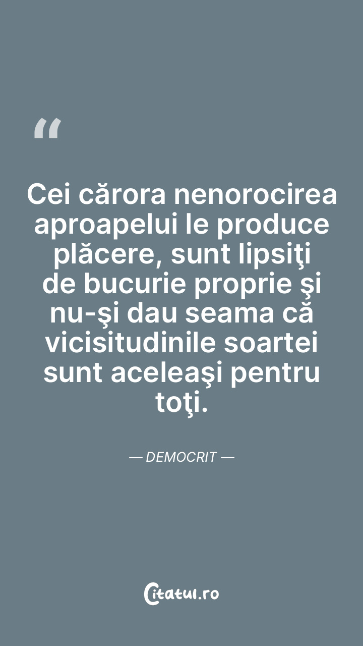 Cei cărora nenorocirea aproapelui le produce plăcere, sunt lipsiţi de bucurie proprie şi nu-şi dau seama că vicisitudinile soartei sunt aceleaşi pentru toţi. Democrit