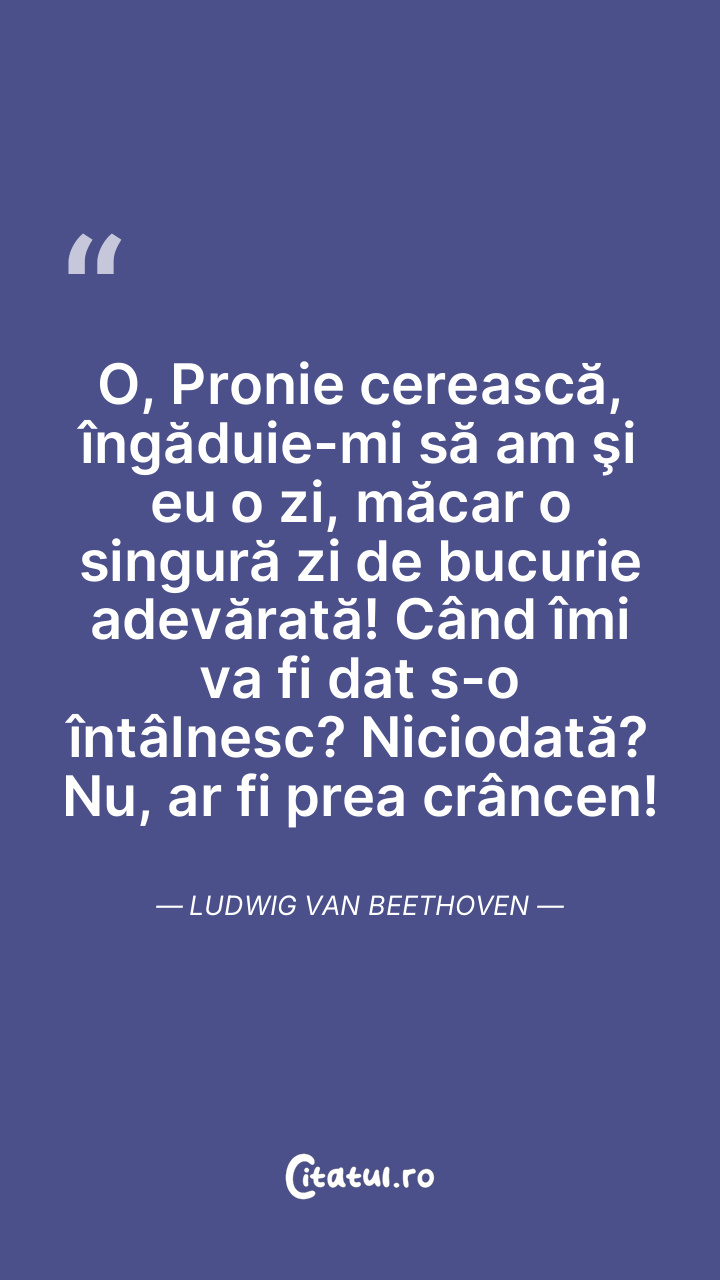 O, Pronie cerească, îngăduie-mi să am şi eu o zi, măcar o singură zi de bucurie adevărată! Când îmi va fi dat s-o întâlnesc? Niciodată? Nu, ar fi prea crâncen! Ludwig van Beethoven