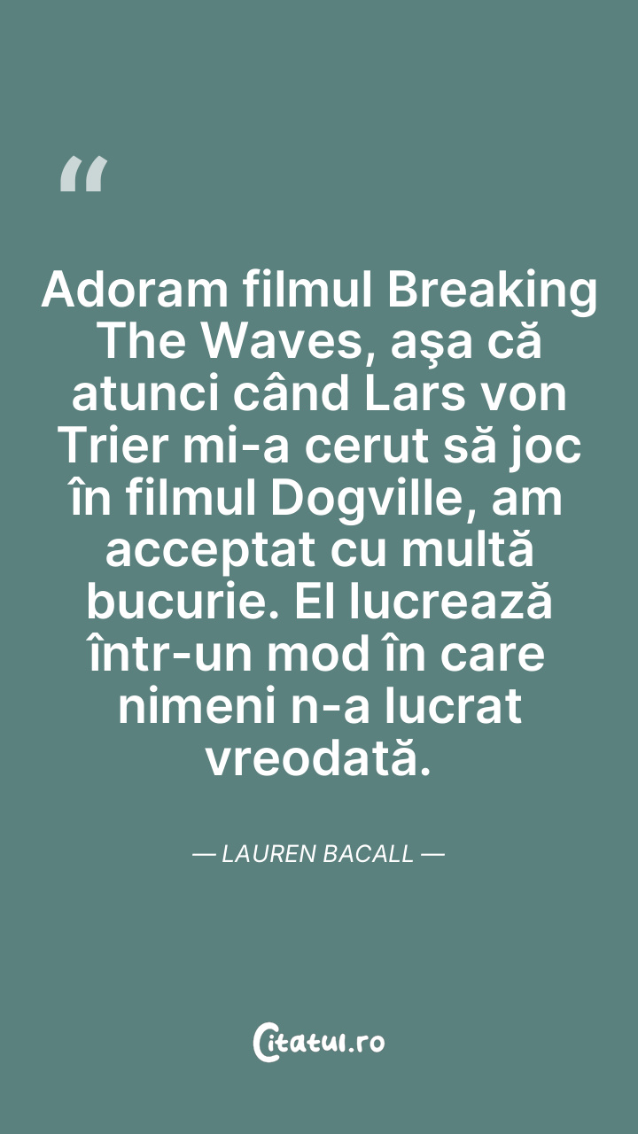 Adoram filmul Breaking The Waves, aşa că atunci când Lars von Trier mi-a cerut să joc în filmul Dogville, am acceptat cu multă bucurie. El lucrează într-un mod în care nimeni n-a lucrat vreodată. Lauren Bacall