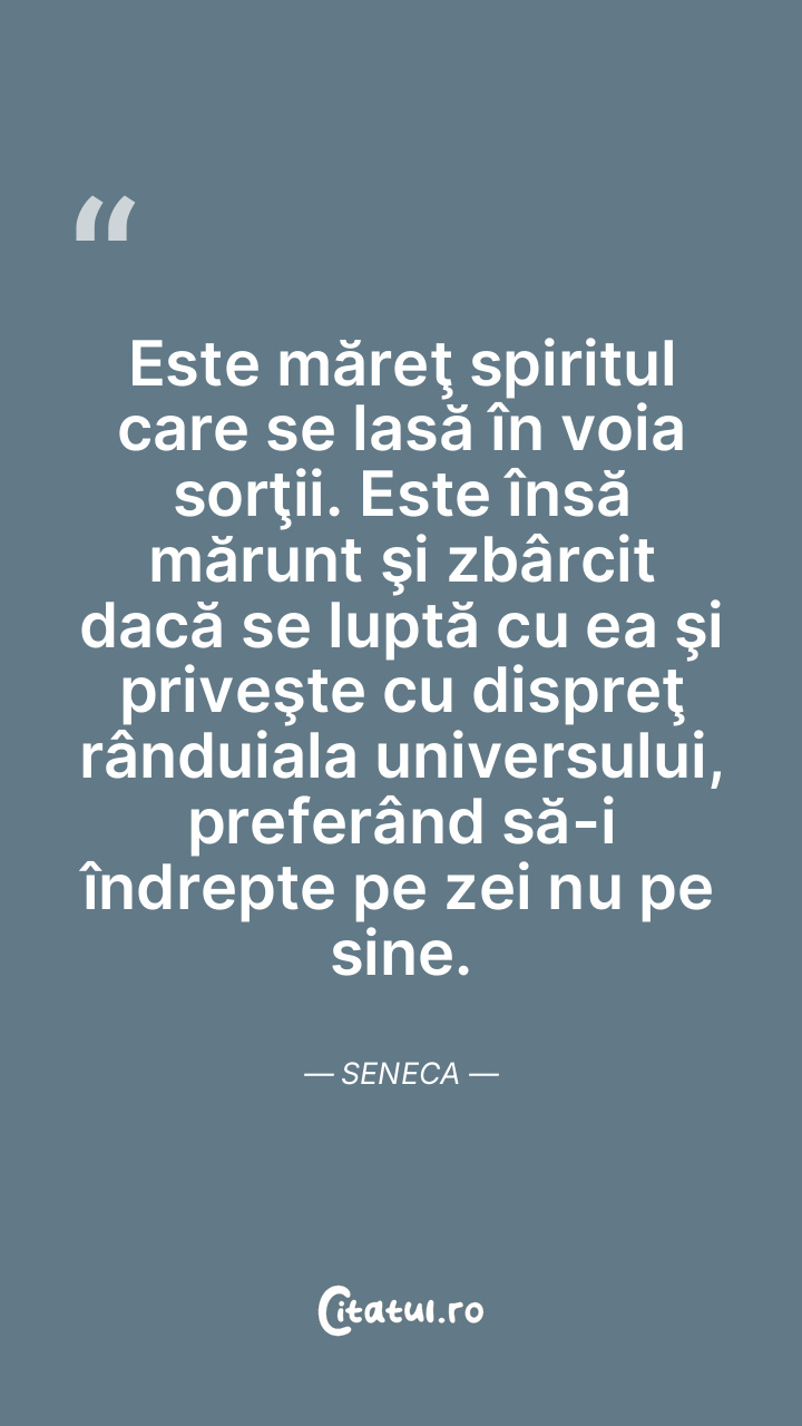 Este măreţ spiritul care se lasă în voia sorţii. Este însă mărunt şi zbârcit dacă se luptă cu ea şi priveşte cu dispreţ rânduiala universului, preferând să-i îndrepte pe zei nu pe sine. Seneca