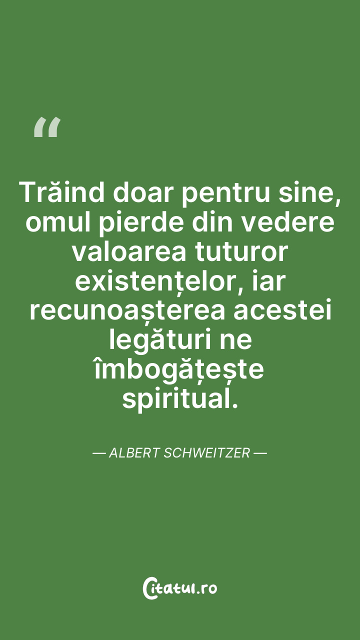 Trăind doar pentru sine, omul pierde din vedere valoarea tuturor existențelor, iar recunoașterea acestei legături ne îmbogățește spiritual. Albert Schweitzer