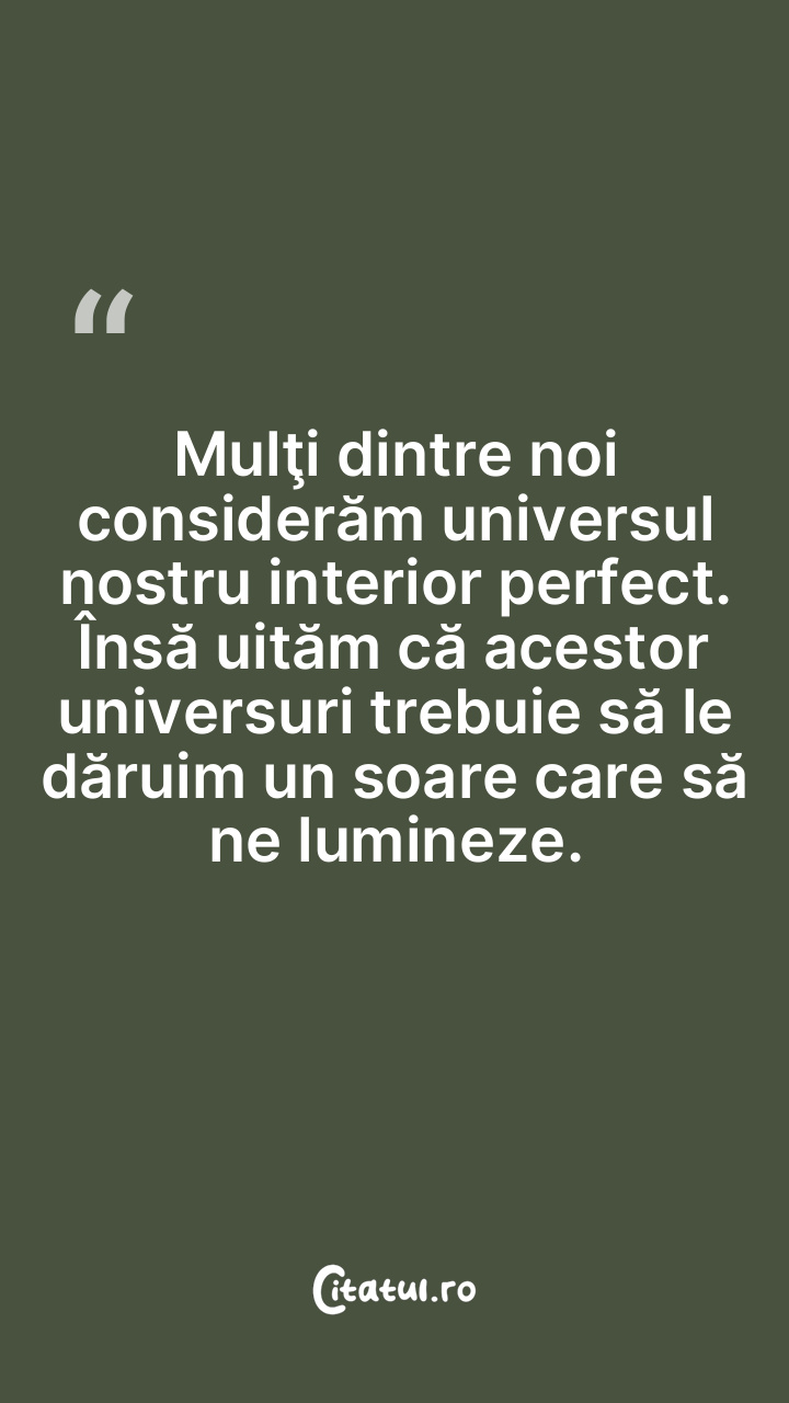 Mulţi dintre noi considerăm universul nostru interior perfect. Însă uităm că acestor universuri trebuie să le dăruim un soare care să ne lumineze.