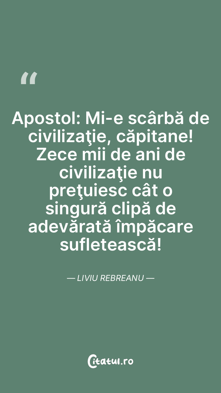 Apostol: Mi-e scârbă de civilizaţie, căpitane! Zece mii de ani de civilizaţie nu preţuiesc cât o singură clipă de adevărată împăcare sufletească! Liviu Rebreanu