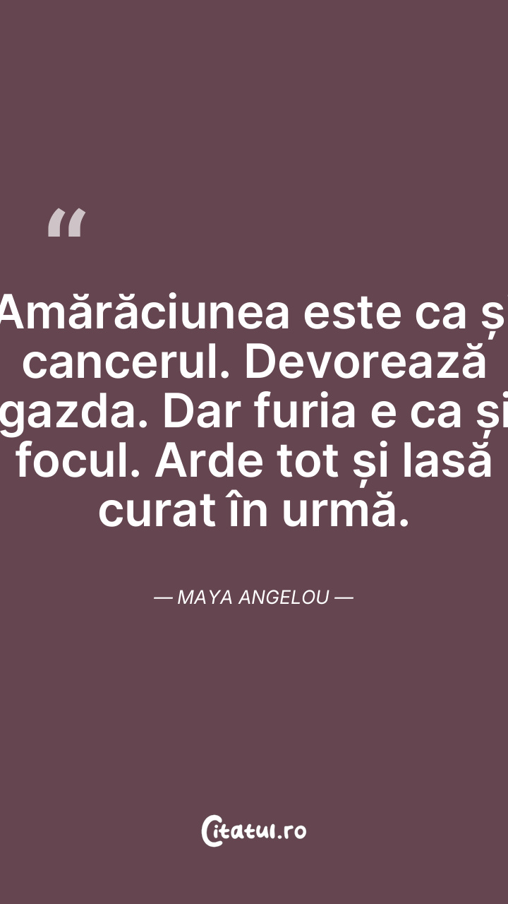 Amărăciunea este ca și cancerul. Devorează gazda. Dar furia e ca și focul. Arde tot și lasă curat în urmă. Maya Angelou
