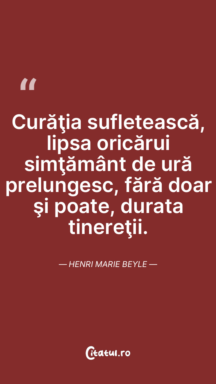 Curăţia sufletească, lipsa oricărui simţământ de ură prelungesc, fără doar şi poate, durata tinereţii. Henri Marie Beyle