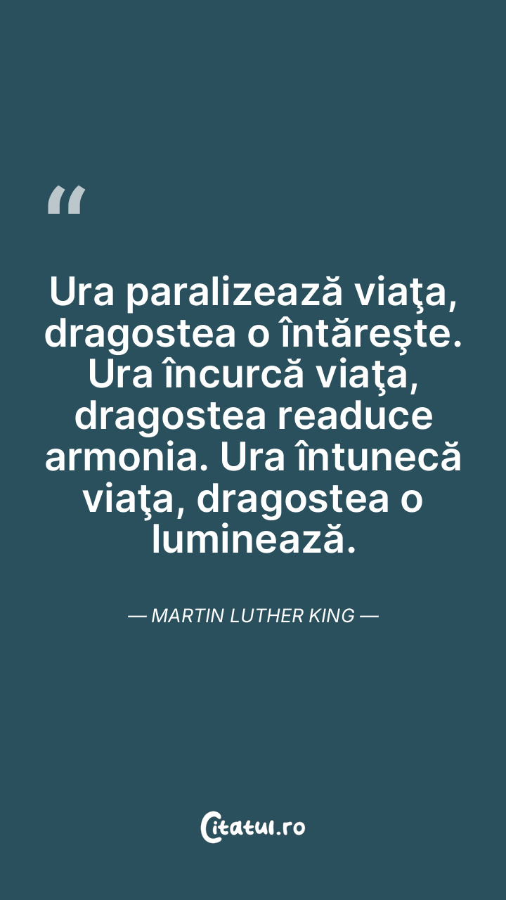 Ura paralizează viaţa, dragostea o întăreşte. Ura încurcă viaţa, dragostea readuce armonia. Ura întunecă viaţa, dragostea o luminează. Martin Luther King