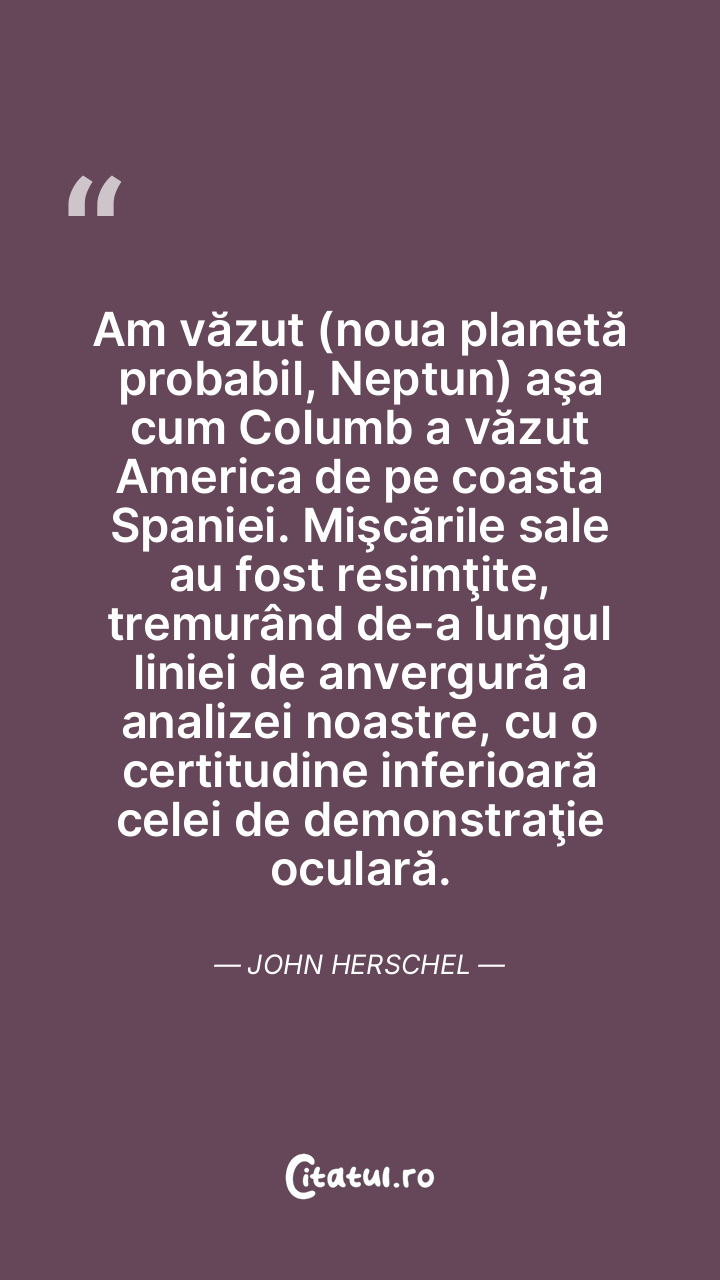 Am văzut (noua planetă probabil, Neptun) aşa cum Columb a văzut America de pe coasta Spaniei. Mişcările sale au fost resimţite, tremurând de-a lungul liniei de anvergură a analizei noastre, cu o certitudine inferioară celei de demonstraţie oculară. John Herschel