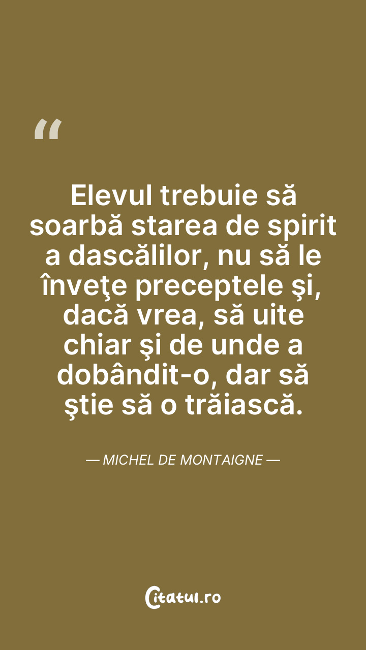 Elevul trebuie să soarbă starea de spirit a dascălilor, nu să le înveţe preceptele şi, dacă vrea, să uite chiar şi de unde a dobândit-o, dar să ştie să o trăiască. Michel de Montaigne