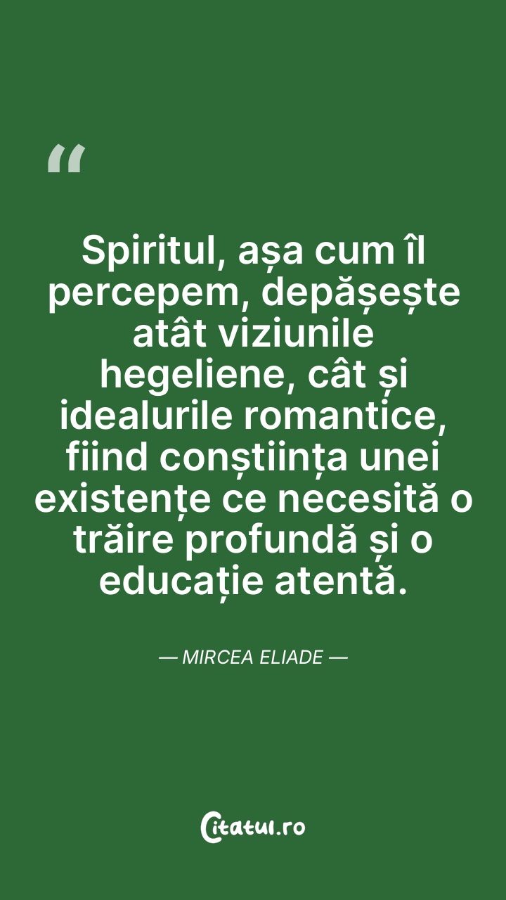 Spiritul, așa cum îl percepem, depășește atât viziunile hegeliene, cât și idealurile romantice, fiind conștiința unei existențe ce necesită o trăire profundă și o educație atentă. Mircea Eliade