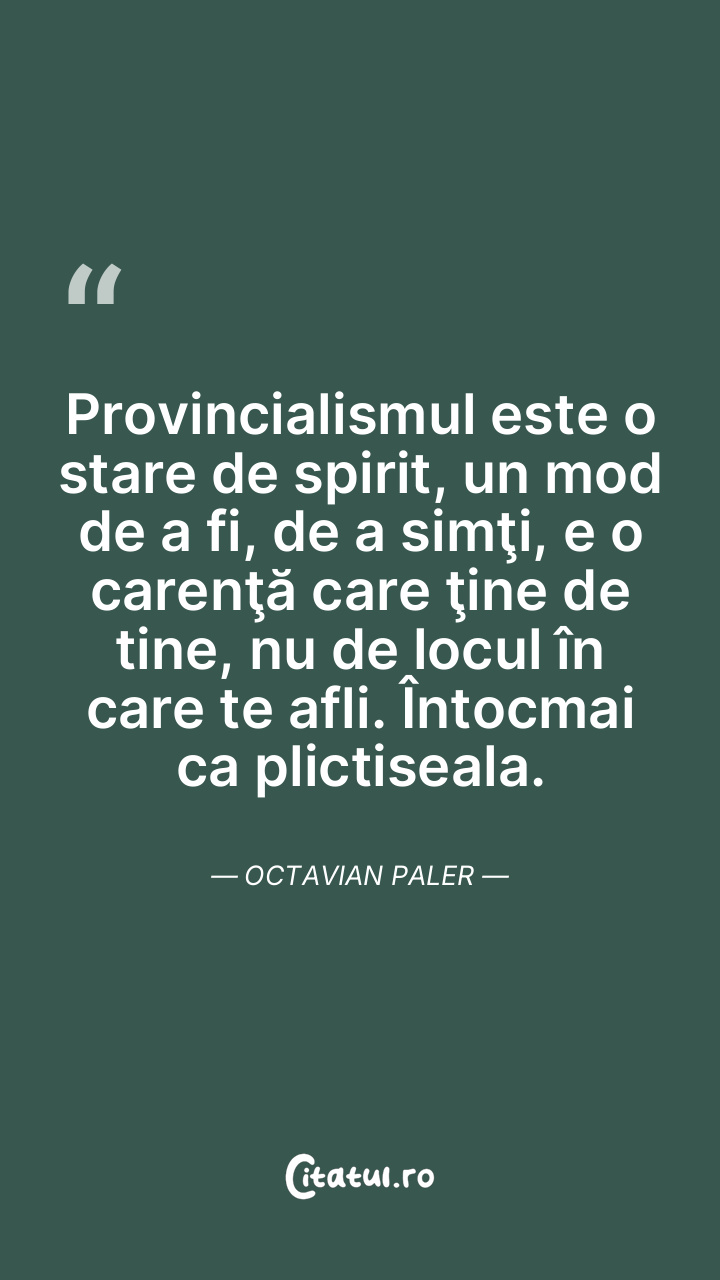 Provincialismul este o stare de spirit, un mod de a fi, de a simţi, e o carenţă care ţine de tine, nu de locul în care te afli. Întocmai ca plictiseala. Octavian Paler