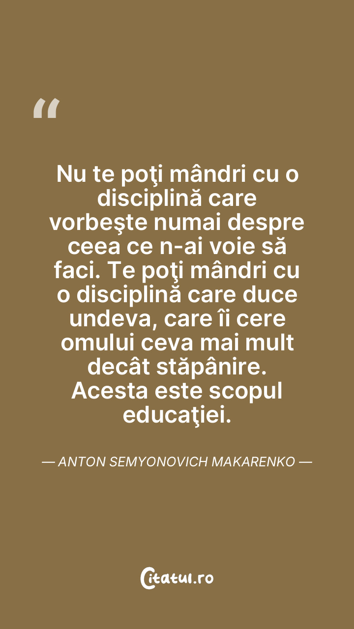 Nu te poţi mândri cu o disciplină care vorbeşte numai despre ceea ce n-ai voie să faci. Te poţi mândri cu o disciplină care duce undeva, care îi cere omului ceva mai mult decât stăpânire. Acesta este scopul educaţiei. Anton Semyonovich Makarenko