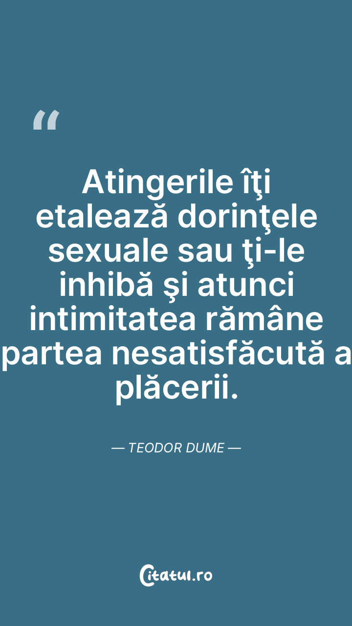 Atingerile îţi etalează dorinţele sexuale sau ţi-le inhibă şi atunci intimitatea rămâne partea nesatisfăcută a plăcerii. Teodor Dume