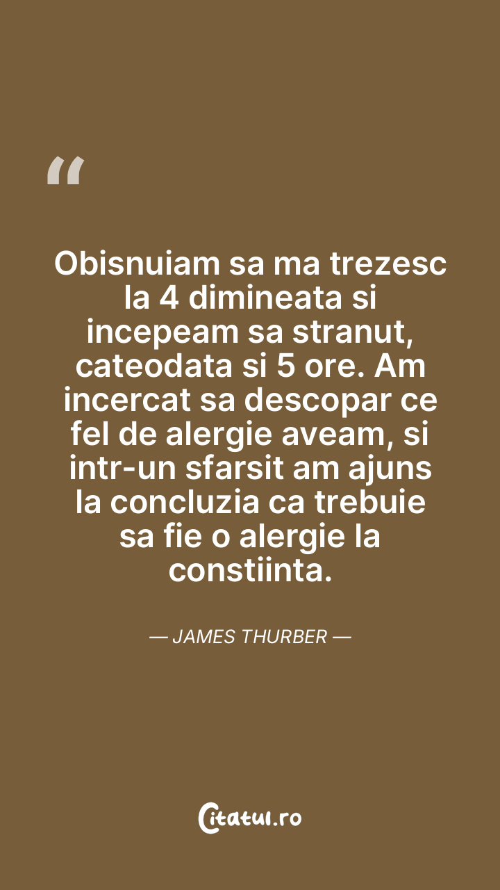 Obisnuiam sa ma trezesc la 4 dimineata si incepeam sa stranut, cateodata si 5 ore. Am incercat sa descopar ce fel de alergie aveam, si intr-un sfarsit am ajuns la concluzia ca trebuie sa fie o alergie la constiinta. James Thurber
