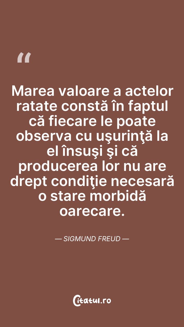 Marea valoare a actelor ratate constă în faptul că fiecare le poate observa cu uşurinţă la el însuşi şi că producerea lor nu are drept condiţie necesară o stare morbidă oarecare. Sigmund Freud