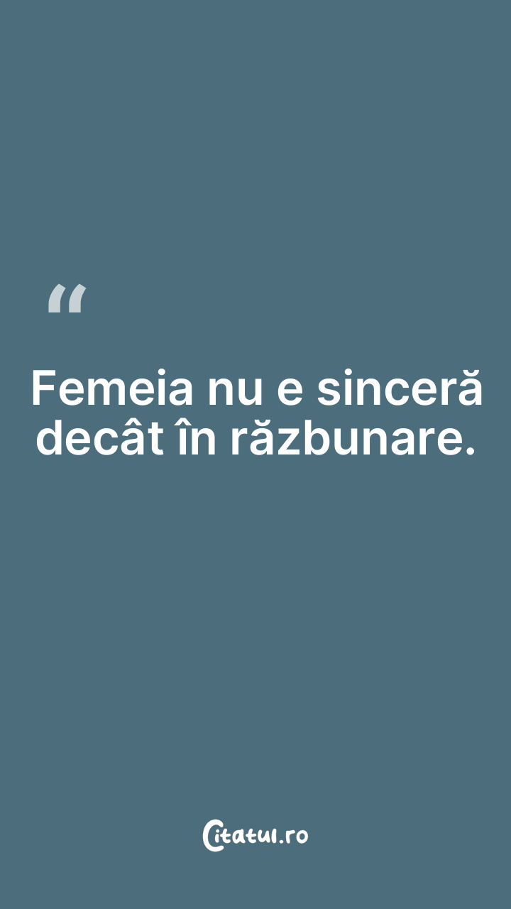 Femeia nu e sinceră decât în răzbunare. ... Categorie: citate triste Dificultate: Foarte ușor de citit! Votează: ★ ★ ★ ★ ★ (0/5 din 0) Distribuiți acest citat? Alegeți platforma preferată: Salvează citatul in telefon/pc Femeia nu e sinceră decât în răzbunare. Copiază Favorite Eroare