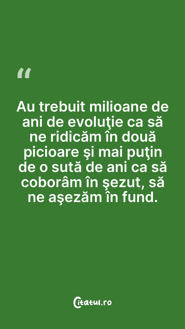 Au trebuit milioane de ani de evoluţie ca să ne ridicăm în două picioare şi mai puţin de o sută de ani ca să coborâm în şezut, să ne aşezăm în fund.