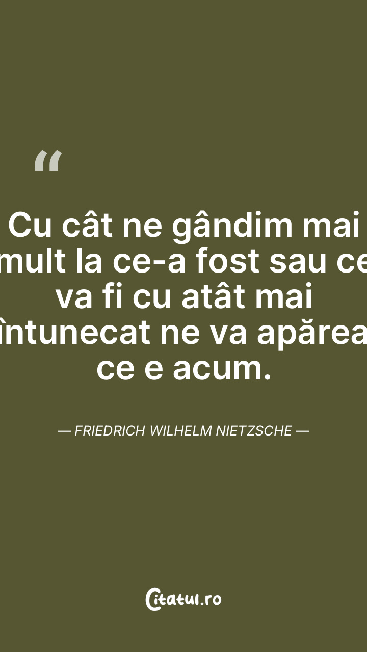 Cu cât ne gândim mai mult la ce-a fost sau ce va fi cu atât mai întunecat ne va apărea ce e acum. Friedrich Wilhelm Nietzsche