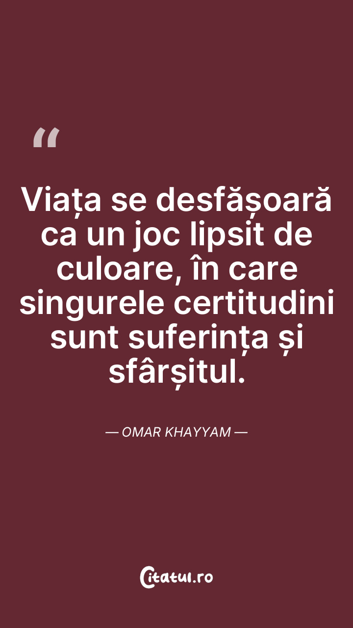Viața se desfășoară ca un joc lipsit de culoare, în care singurele certitudini sunt suferința și sfârșitul. Omar Khayyam