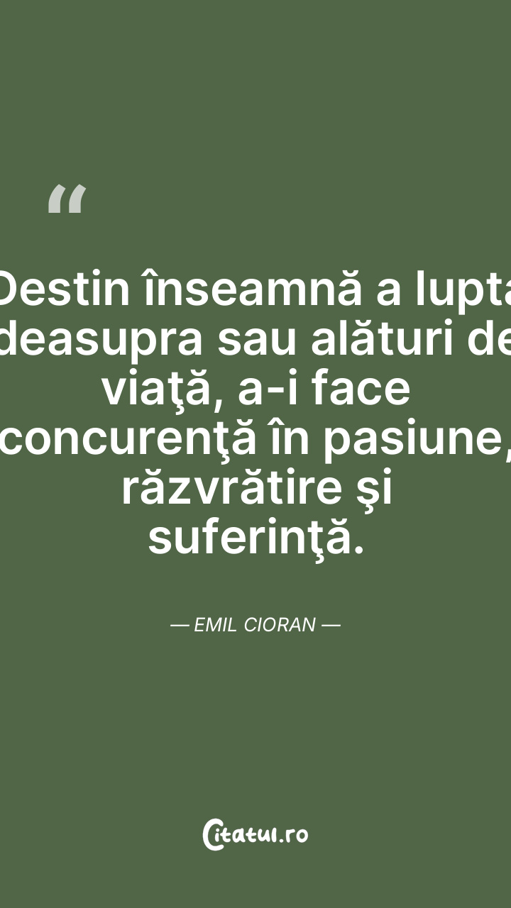 Destin înseamnă a lupta deasupra sau alături de viaţă, a-i face concurenţă în pasiune, răzvrătire şi suferinţă. Emil Cioran
