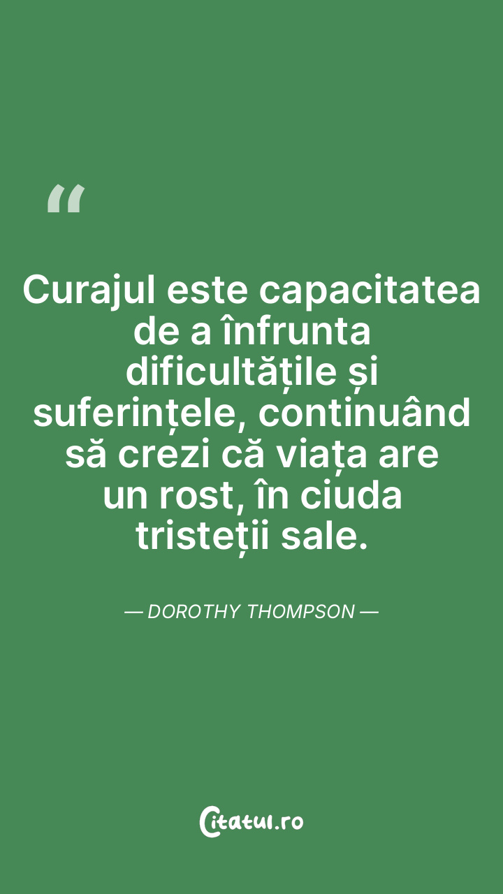 Curajul este capacitatea de a înfrunta dificultățile și suferințele, continuând să crezi că viața are un rost, în ciuda tristeții sale. Dorothy Thompson