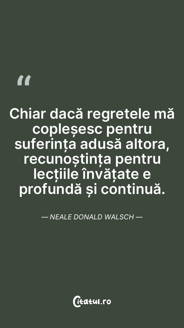Chiar dacă regretele mă copleșesc pentru suferința adusă altora, recunoștința pentru lecțiile învățate e profundă și continuă. Neale Donald Walsch