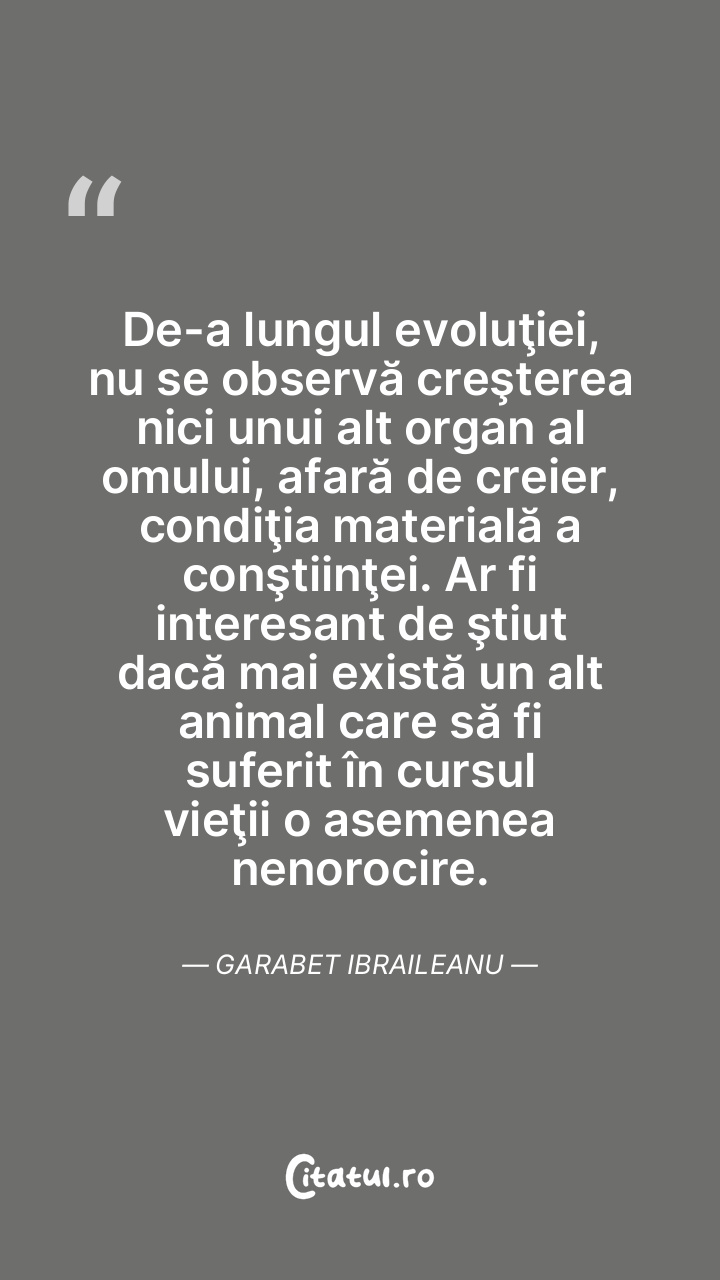 De-a lungul evoluţiei, nu se observă creşterea nici unui alt organ al omului, afară de creier, condiţia materială a conştiinţei. Ar fi interesant de ştiut dacă mai există un alt animal care să fi suferit în cursul vieţii o asemenea nenorocire. Garabet Ibraileanu
