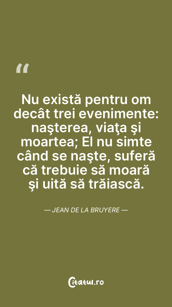 Nu există pentru om decât trei evenimente: naşterea, viaţa şi moartea; El nu simte când se naşte, suferă că trebuie să moară şi uită să trăiască. Jean de La Bruyere