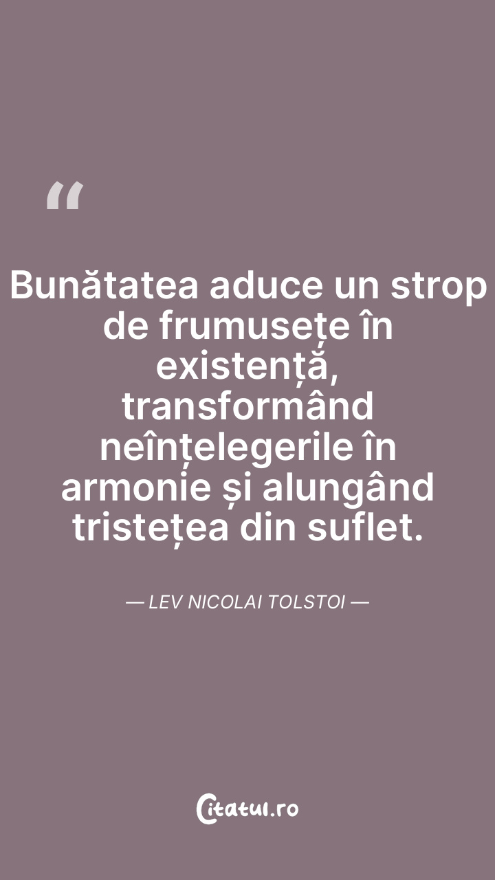 Bunătatea aduce un strop de frumusețe în existență, transformând neînțelegerile în armonie și alungând tristețea din suflet. Lev Nicolai Tolstoi