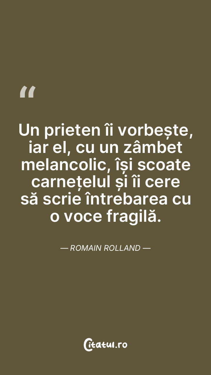 Un prieten îi vorbește, iar el, cu un zâmbet melancolic, își scoate carnețelul și îi cere să scrie întrebarea cu o voce fragilă. Romain Rolland
