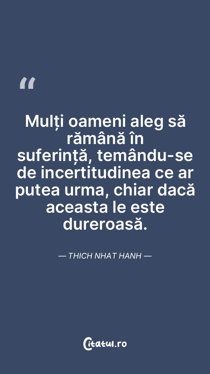 Mulți oameni aleg să rămână în suferință, temându-se de incertitudinea ce ar putea urma, chiar dacă aceasta le este dureroasă. Thich Nhat Hanh
