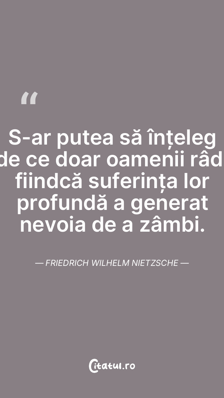 S-ar putea să înțeleg de ce doar oamenii râd, fiindcă suferința lor profundă a generat nevoia de a zâmbi. Friedrich Wilhelm Nietzsche