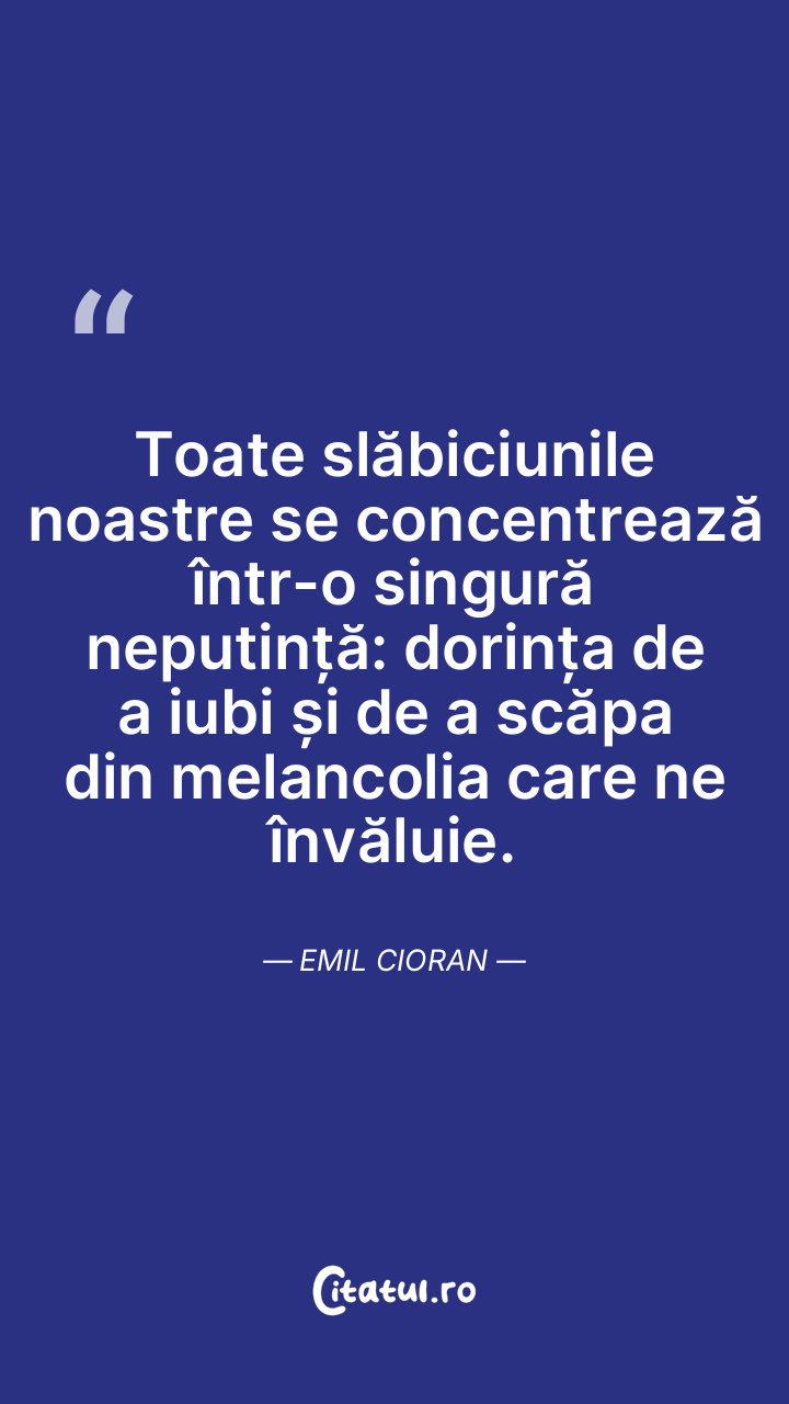 Toate slăbiciunile noastre se concentrează într-o singură neputință: dorința de a iubi și de a scăpa din melancolia care ne învăluie. Emil Cioran