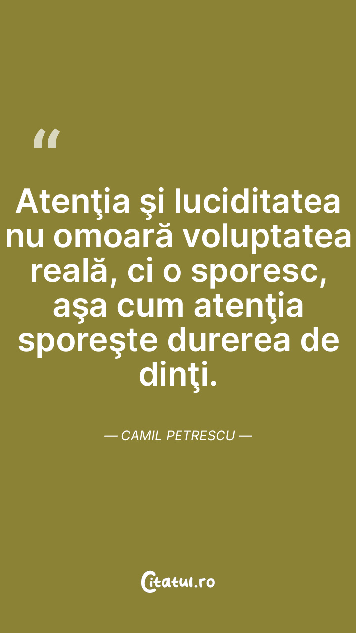 Atenţia şi luciditatea nu omoară voluptatea reală, ci o sporesc, aşa cum atenţia sporeşte durerea de dinţi. Camil Petrescu