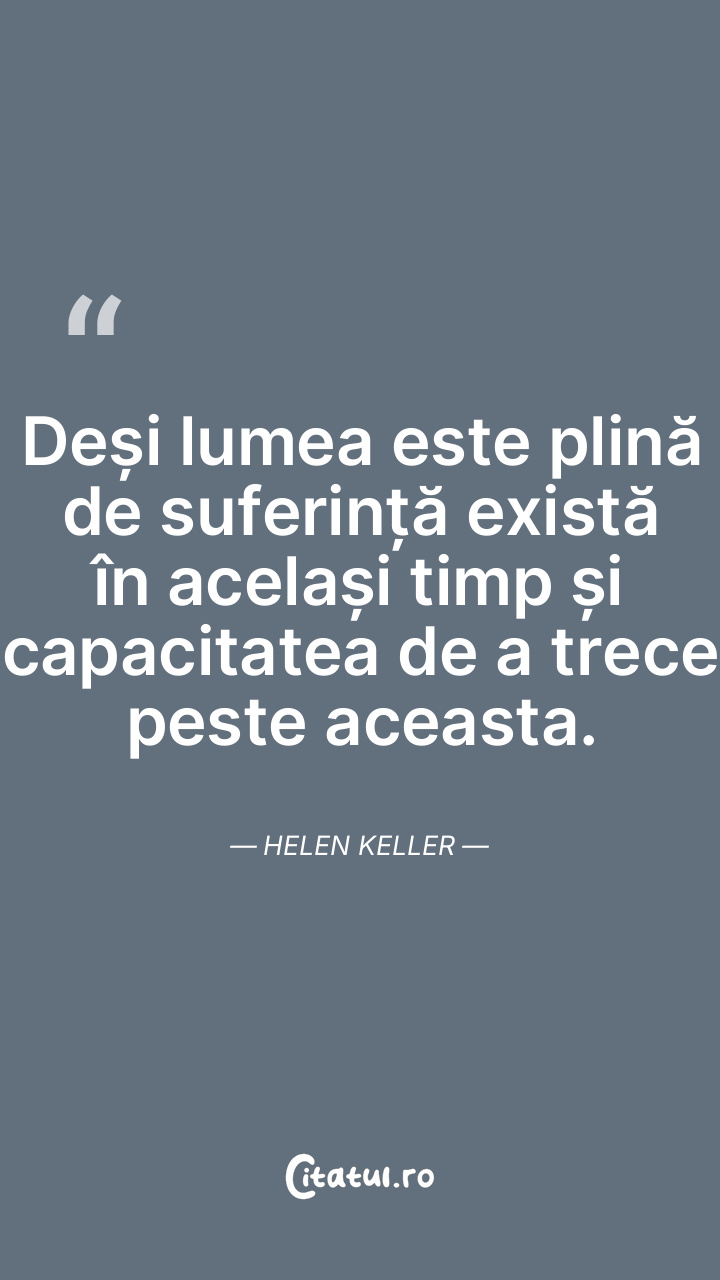 Deși lumea este plină de suferință există în același timp și capacitatea de a trece peste aceasta. Helen Keller