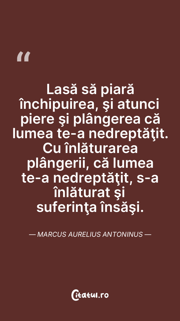 Lasă să piară închipuirea, şi atunci piere şi plângerea că lumea te-a nedreptăţit. Cu înlăturarea plângerii, că lumea te-a nedreptăţit, s-a înlăturat şi suferinţa însăşi. Marcus Aurelius Antoninus